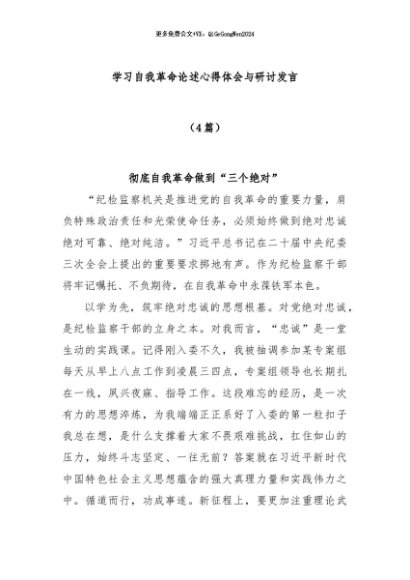 / 【七哥公文】2024年:(4篇)学习自我革命论述心得体会与研讨发言+更多免费公文+VX:QiGeGongWen2024