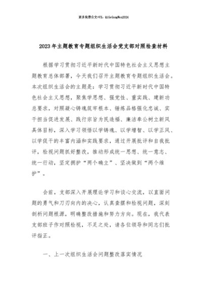 【七哥公文】2024年:2023年主题教育专题组织生活会党支部对照检查材料+更多免费公文+VX:QiGeGongWen2024