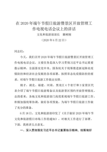 时令材料∣端午节:20200622在2020年端午节假日旅游暨景区开放管理工作会议上的讲话(节日旅游、安全防范)——文化和旅游部部长 雒树刚