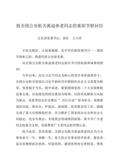 / 时令材料∣重阳节:20221004致全国公安机关离退休老同志的重阳节慰问信——公安部部长 王小洪