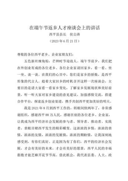 / 时令材料∣端午节:20230621在端午节返乡人才座谈会上的讲话(招商引资)——西平县县长 侯公涛