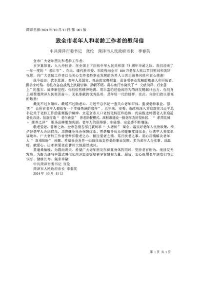 时令材料∣重阳节:20241011致全市老年朋友和老龄工作者的慰问信——菏泽