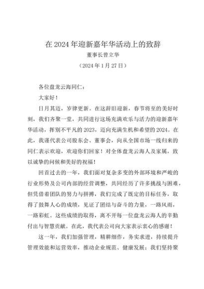 时令材料∣春节:20240127在2024年迎新嘉年华活动上的致辞——公司董事长