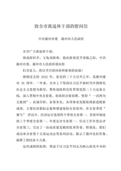 时令材料∣春节:20230120致全市离退休干部的慰问信——滁州市委市政府