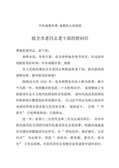 时令材料∣春节:20230120致全市老同志老干部的慰问信——成都市委市政府