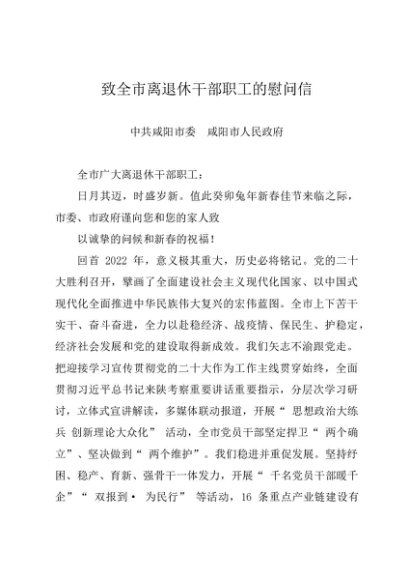 时令材料∣春节:20230126致全市离退休干部职工的慰问信——咸阳市委市政府