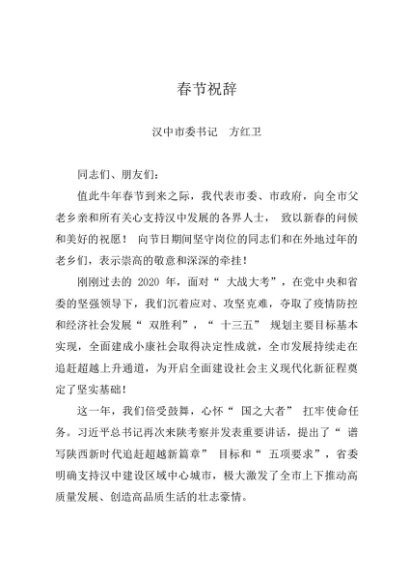 时令材料∣春节:20210201春节祝辞——汉中市委书记 方红卫