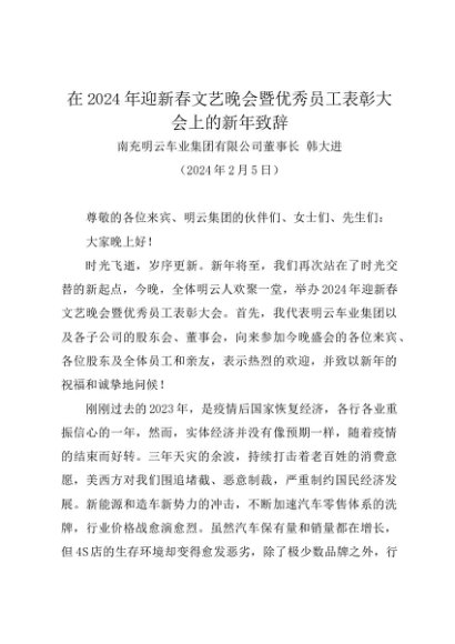 时令材料∣春节:20240205在2024年迎新春文艺晚会暨优秀员工表彰大会上的新年致辞——南充明云车业集团董事长