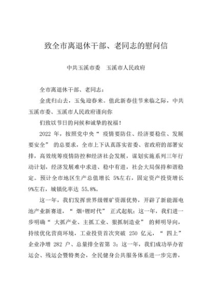 时令材料∣春节:20230120致全市离退休干部、老同志的慰问信——玉溪市委市政府