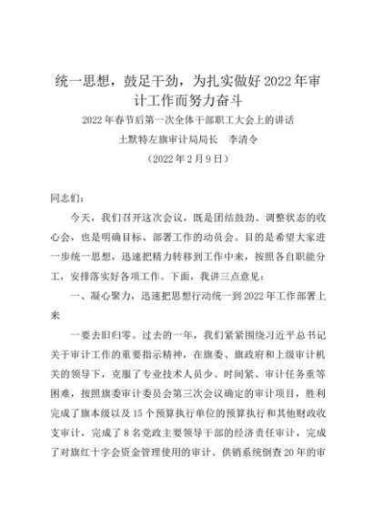 / 时令材料∣春节:20220209春节后审计局第一次全体干部职工大会上的讲话——审计局局长 李清令