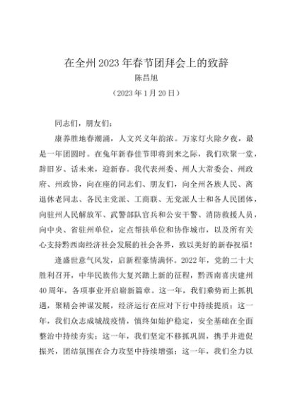 时令材料∣春节:20230120在2023年春节团拜会上的致辞——贵州省委书记