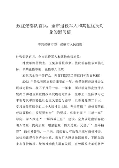 时令材料∣春节:20230120致驻张部队官兵,全市退役军人和其他优抚对象的慰问信——张掖市委市政府