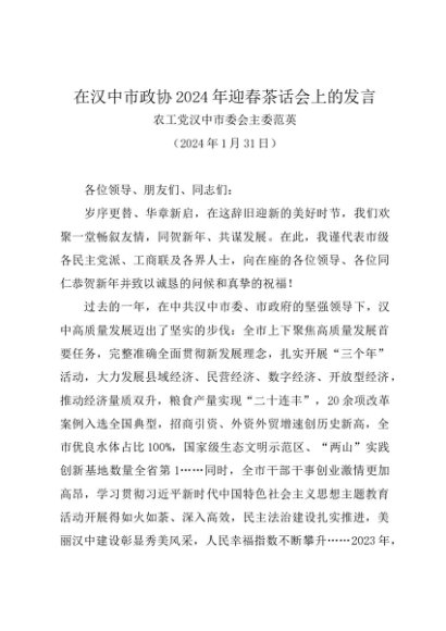 时令材料∣春节:20240131在汉中市政协2024年迎春茶话会上的发言——农工党汉中市委会主委