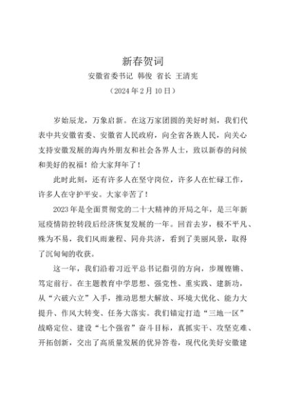 时令材料∣春节:20240210新春贺词——安徽省委书记、省长