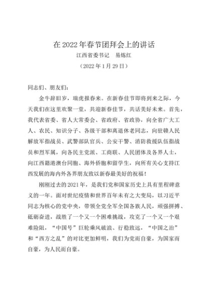 / 时令材料∣春节:20220129在2022年春节团拜会上的讲话——江西省委书记 易炼红