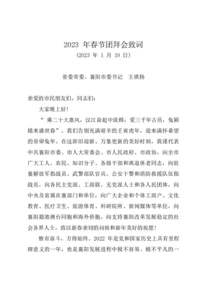/ 时令材料∣春节:20230119春节团拜会致词——襄阳市委书记 王祺扬