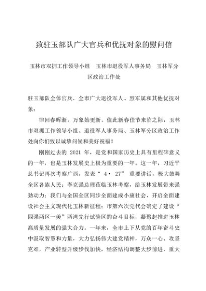 时令材料∣春节:20220129致驻玉部队广大官兵和优抚对象的慰问信——玉林市委市政府