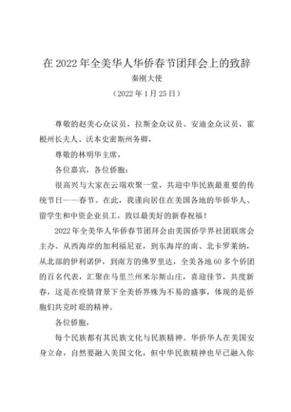 / 时令材料∣春节:20220125在2022年全美华人华侨春节团拜会上的致辞——驻美大使