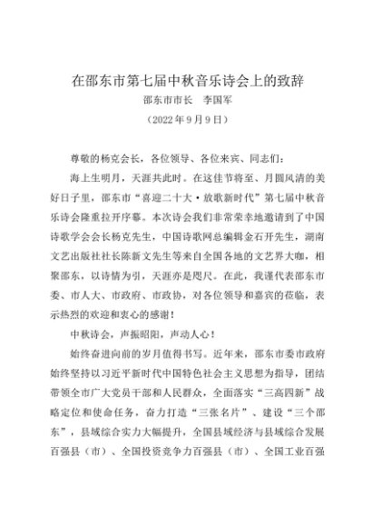 / 时令材料∣中秋节:20220909在邵东市第七届中秋音乐诗会上的致辞——邵东市市长 李国军