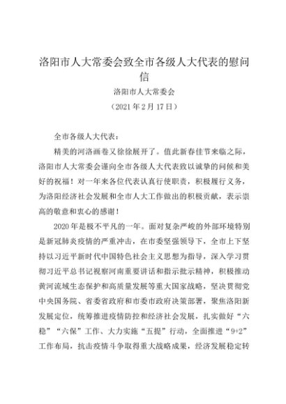 时令材料∣春节:20210217致全市各级人大代表的慰问信——洛阳市人大常委会