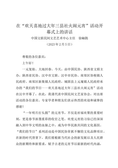 / 时令材料∣元宵节:20230205在“欢天喜地过大年三县社火闹元宵”活动开幕式上的讲话——中国文联 徐岫鹃
