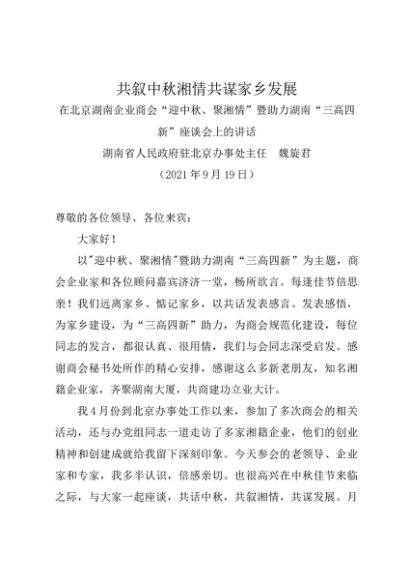 时令材料∣中秋节:在北京湖南企业商会“迎中秋、聚湘情”暨助力湖南“三高四新”座谈会上的讲话——湖南省驻京办 魏旋君