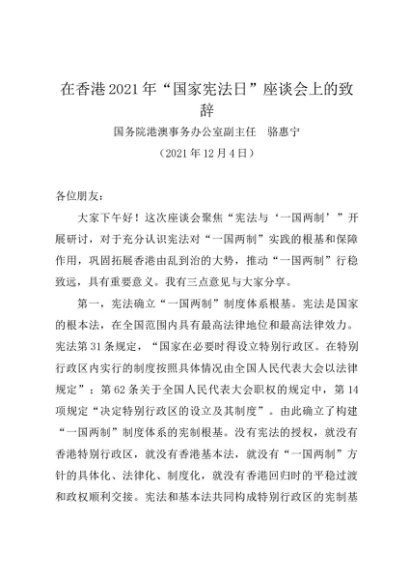 时令材料∣1205宪法日:20211204在香港2021年国家宪法日座谈会上的致辞——国务院港澳事务办公室副主任 骆惠宁