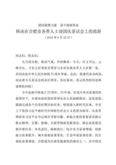 / 时令材料∣1001国庆节:20241001韩冰在合肥市各界人士迎国庆茶话会上的致辞