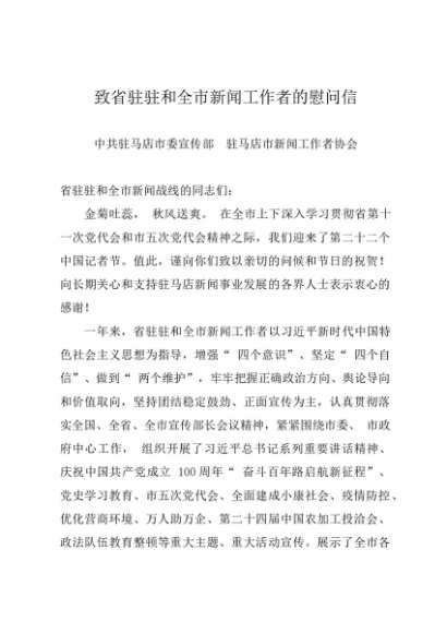 / 时令材料∣1108记者节:20211108致省驻驻和全市新闻工作者的慰问信——驻马店市委宣传部
