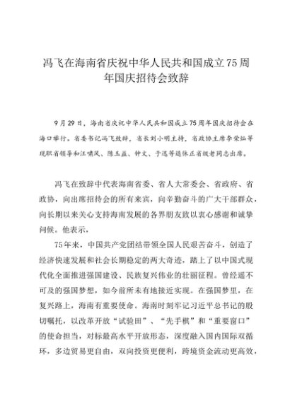 / 时令材料∣1001国庆节:20241001冯飞在海南省庆祝中华人民共和国成立75周年国庆招待会致辞