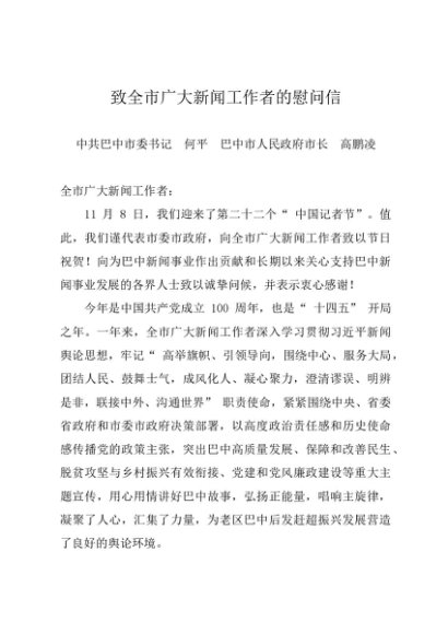 / 时令材料∣1108记者节:20211108致全市广大新闻工作者的慰问信——巴中市委市政府