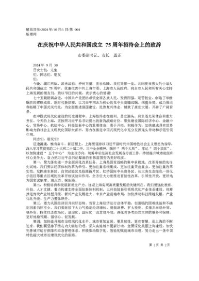 / 时令材料∣1001国庆节:20241001在庆祝中华人民共和国成立 75 周年招待会上的致辞——市长 龚正