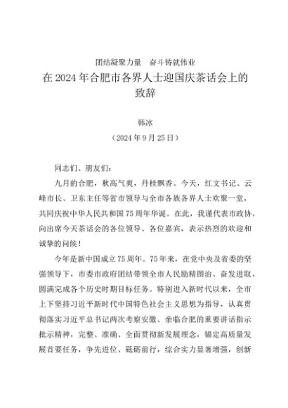 / 时令材料∣1001国庆节:20241001在2024年合肥市各界人士迎国庆茶话会上的致辞