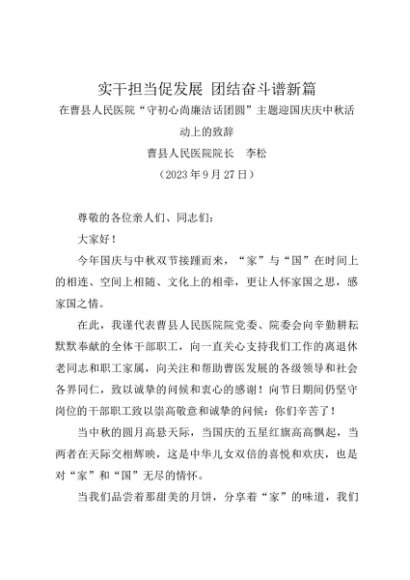 / 时令材料∣1001国庆节:20230927在曹县人民医院“守初心尚廉洁话团圆”主题迎国庆庆中秋活动上的致辞——院长 李松