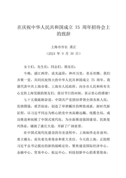/ 时令材料∣1001国庆节:20241001在庆祝中华人民共和国成立 75 周年招待会上的致辞——上海市市长 龚正