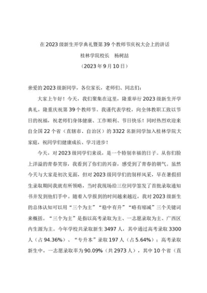 时令材料∣0910教师节:20230910在2023级新生开学典礼暨第39个教师节庆祝大会上的讲话——桂林学院校长 杨树喆