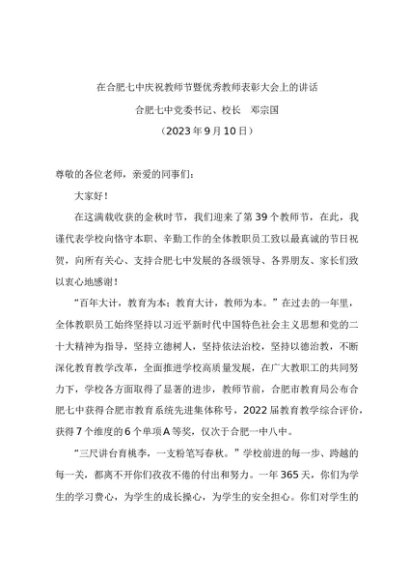/ 时令材料∣0910教师节:20230910在合肥七中庆祝教师节暨优秀教师表彰大会上的讲话——校长 邓宗国