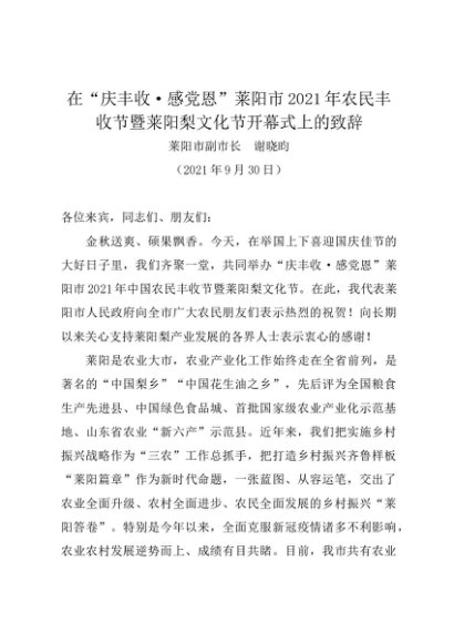 时令材料∣0923丰收节:20210930在“庆丰收·感党恩”农民丰收节暨莱阳梨文化节开幕式上的致辞——莱阳市副市长 谢晓昀