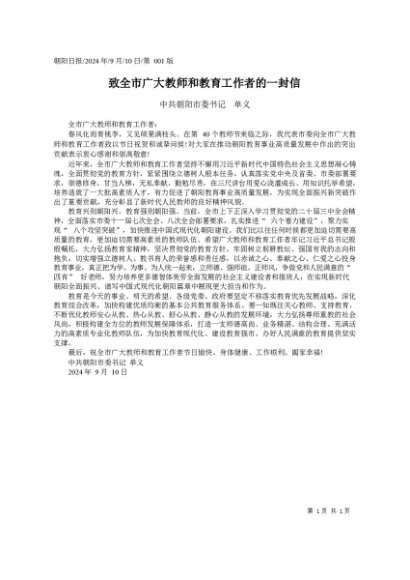 / 时令材料∣0910教师节:20240910致全市广大教师和教育工作者的一封信——朝阳市委书记 单义