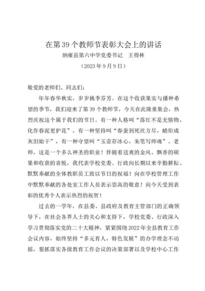 / 时令材料∣0910教师节:20230909纳雍县第六中学书记王得林:在第39个教师节表彰大会上的讲话