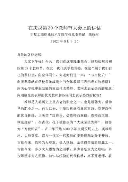 / 时令材料∣0910教师节:20230909宁夏工商职业技术学院党委书记:在庆祝第39个教师节大会上的讲话