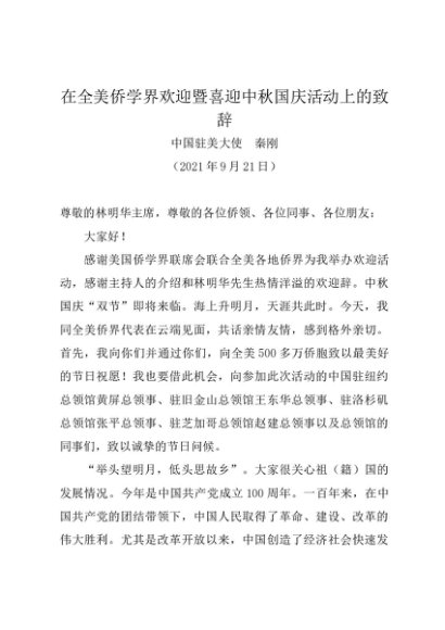 时令材料∣1001国庆节:20210921在全美侨学界欢迎暨喜迎中秋国庆活动上的致辞——中国驻美大使