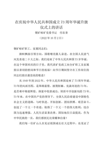 时令材料∣1001国庆节:20221002在庆祝中华人民共和国成立73周年华诞升旗仪式上的讲话——铜矿峪矿党委书记 付忠奎