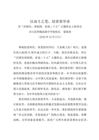 时令材料∣1001国庆节:20221002在“庆国庆、颂祖国,喜迎二十大”主题班会上的讲话——合江县利城高级中学校校长 梁海涛