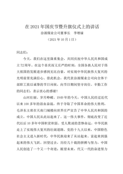 / 时令材料∣1001国庆节:20211001在2021年国庆节暨升旗仪式上的讲话——汾源煤业公司董事长 李增禄