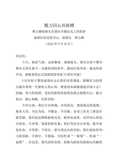 / 时令材料∣1001国庆节:20220930在国庆升旗仪式上的致辞——新洲区检察院检察长 顾玉梅