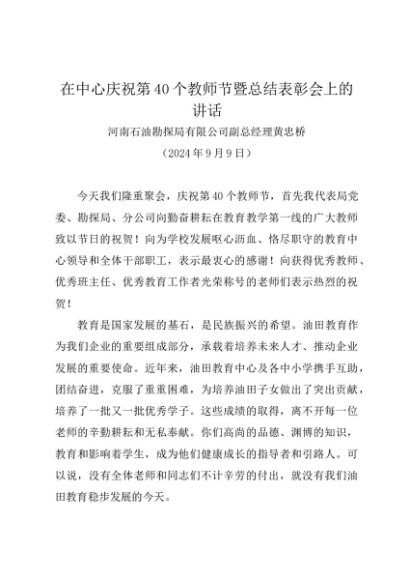 时令材料∣0910教师节:20240910在中心庆祝第40个教师节暨总结表彰会上的讲话——河南石油勘探局有限公司副总经理黄忠桥