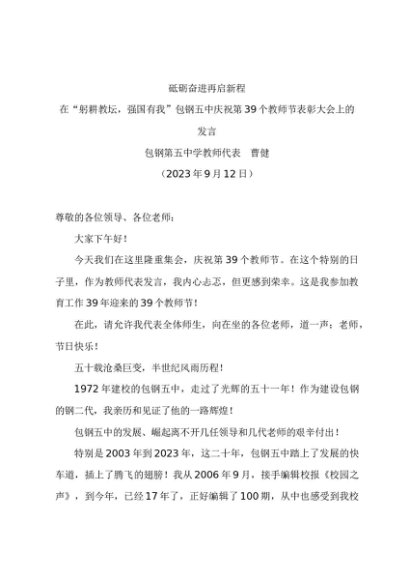 时令材料∣0910教师节:20230912在“躬耕教坛,强国有我”包钢五中庆祝第39个教师节表彰大会上的发言——教师代表 曹健