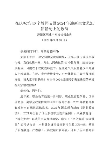 时令材料∣0910教师节:20240910在庆祝第40个教师节暨2024年迎新生文艺汇演活动上的致辞——济阳区职业中专校长杨金勇