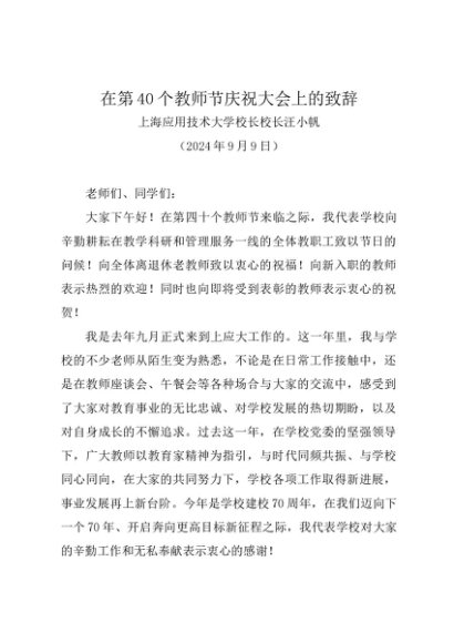 时令材料∣0910教师节:20240910在第40个教师节庆祝大会上的致辞——上海应用技术大学校长校长汪小帆